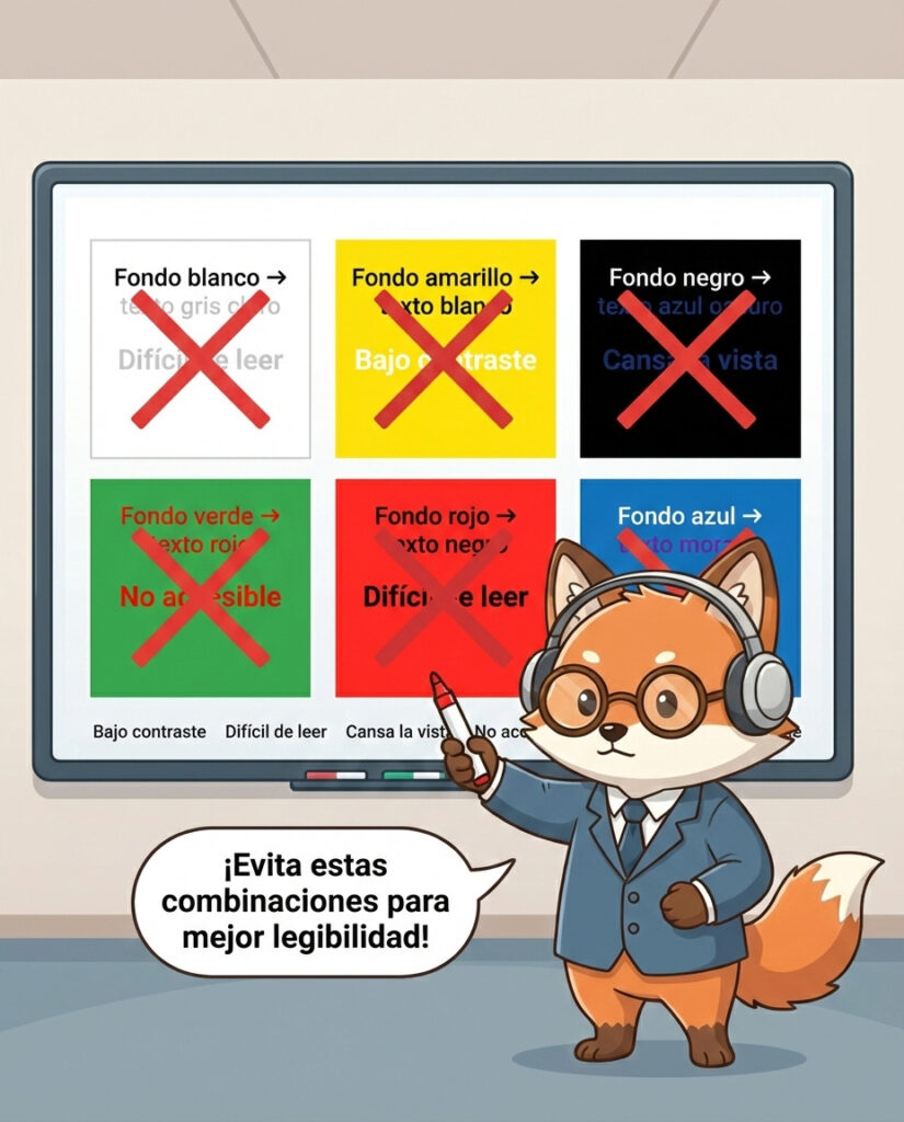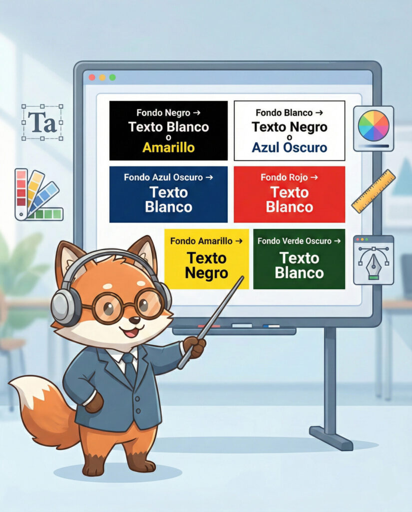 Para explicar este concepto de forma simple y visual, imaginemos a nuestro personaje como un maestro, frente a un pizarrón, enseñando una lección clave: qué colores de texto funcionan mejor sobre cada fondo y por qué.